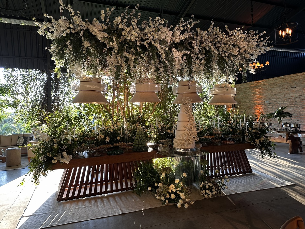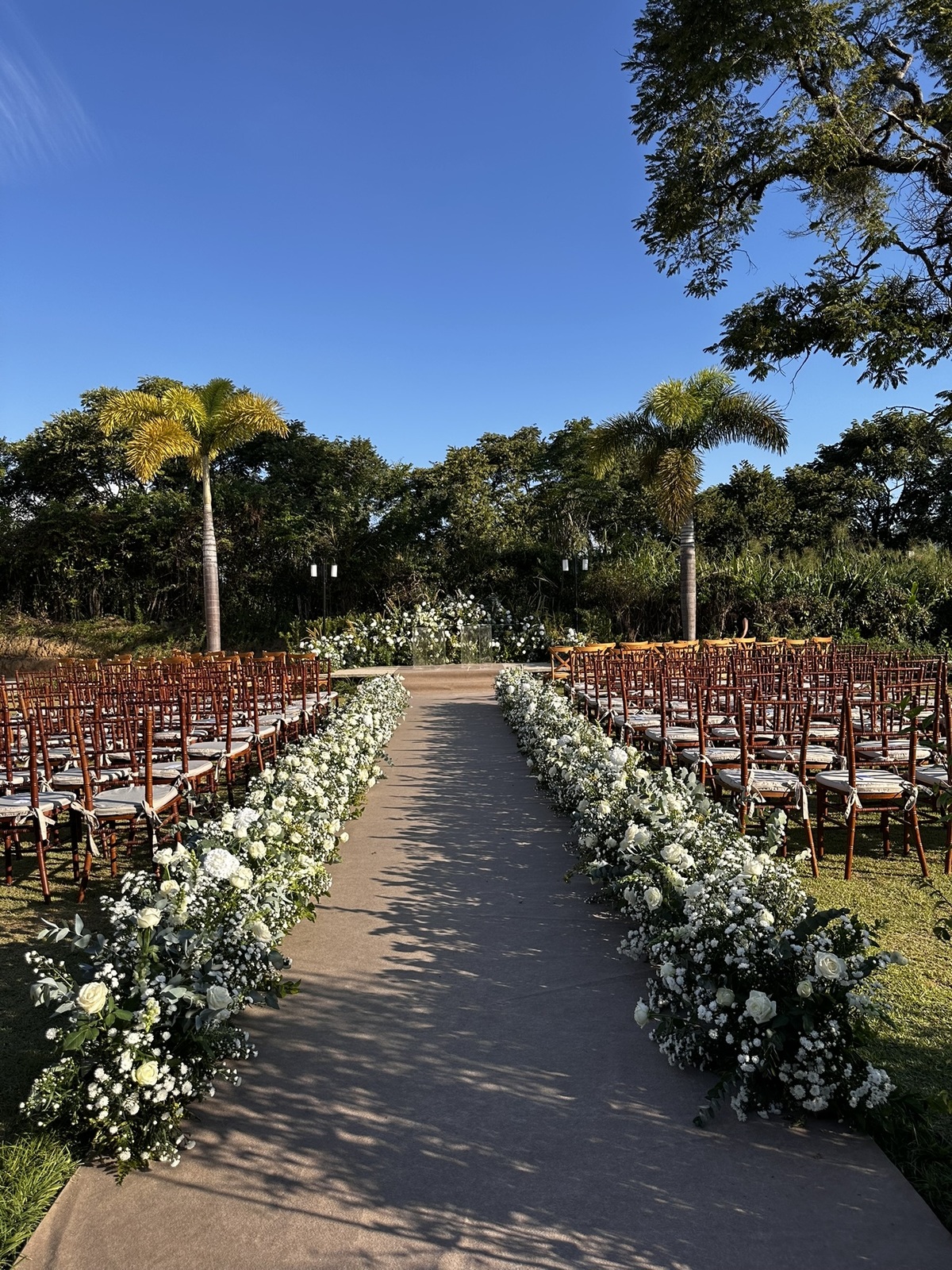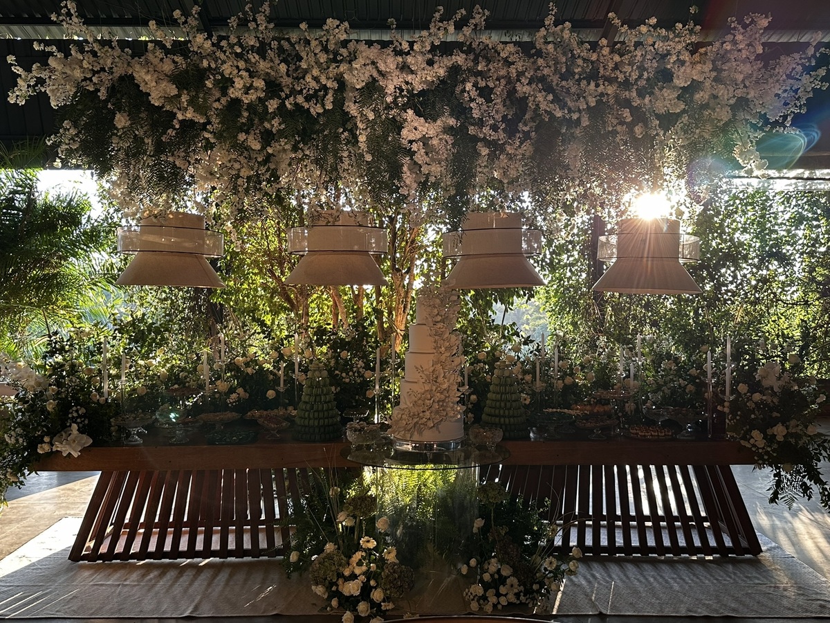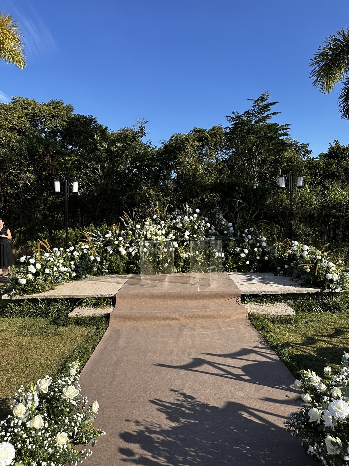 O altar, com base transparente em acrílico e cercado por uma moldura de rosas brancas, folhagens nobres e mini-lustres de chão, refletiu a luz do pôr do sol, criando um momento mágico e inesquecível. O caminho da noiva, ladeado por arranjos generosos, conduziu todos os olhares até o altar, onde a emoção tomou conta.
