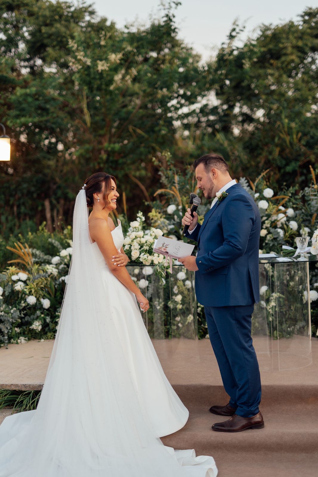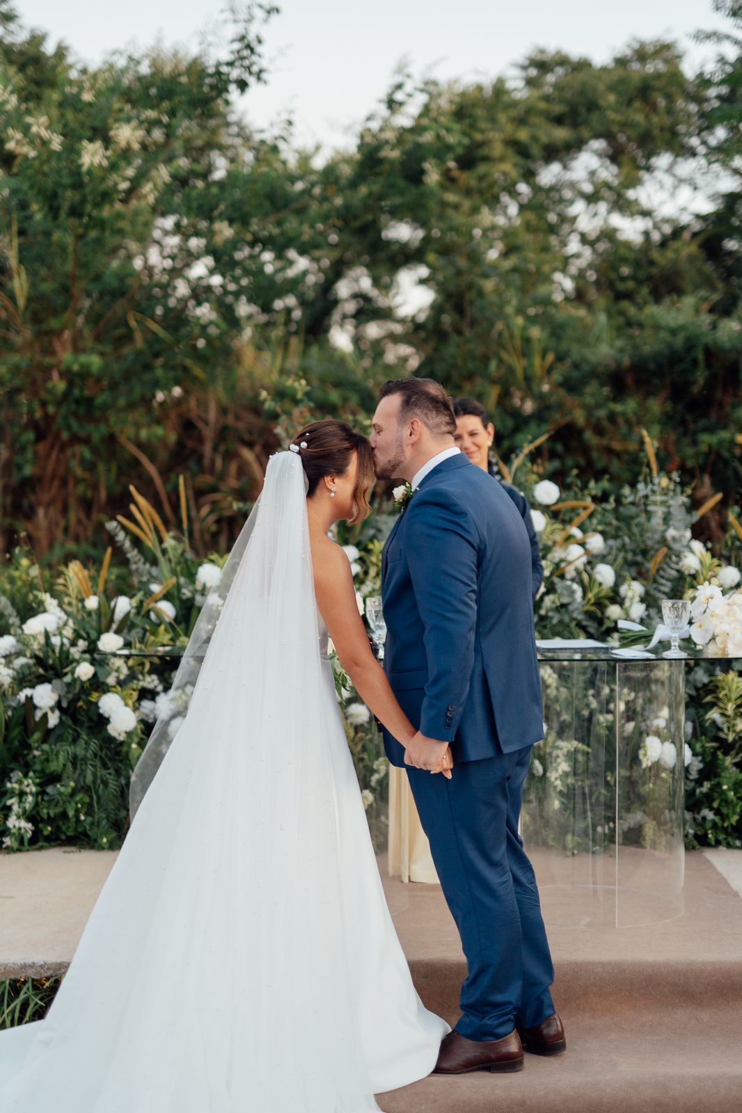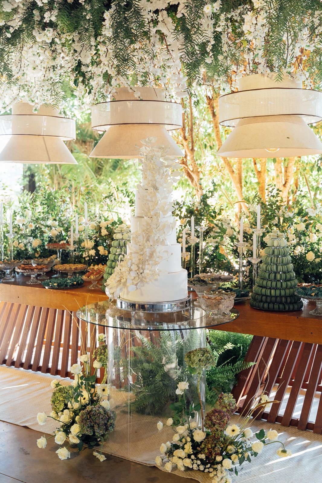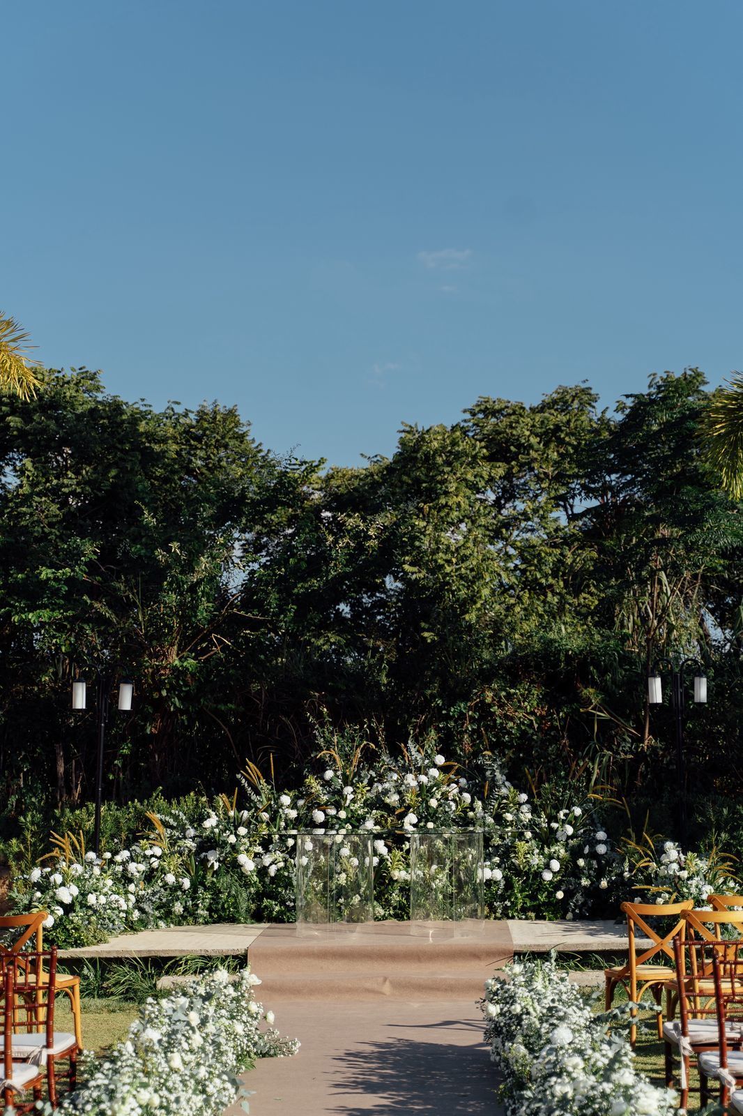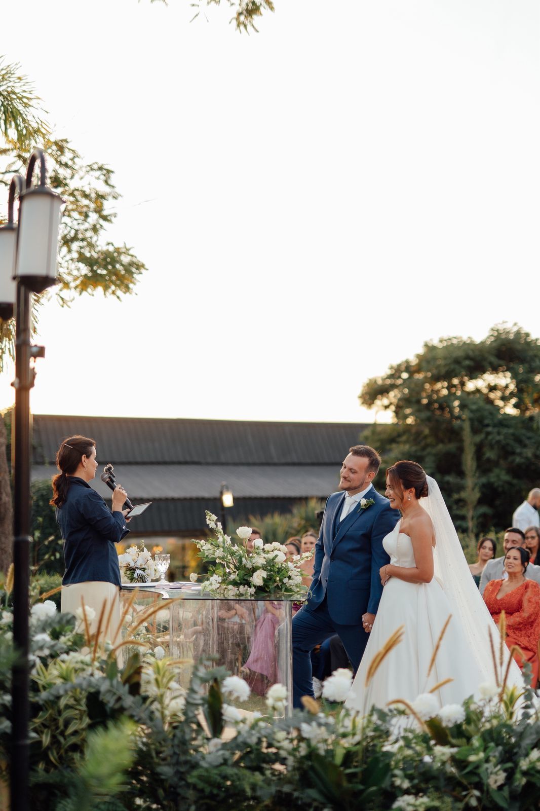 O altar, com base transparente em acrílico e cercado por uma moldura de rosas brancas, folhagens nobres e mini-lustres de chão, refletiu a luz do pôr do sol, criando um momento mágico e inesquecível. O caminho da noiva, ladeado por arranjos generosos, conduziu todos os olhares até o altar, onde a emoção tomou conta.