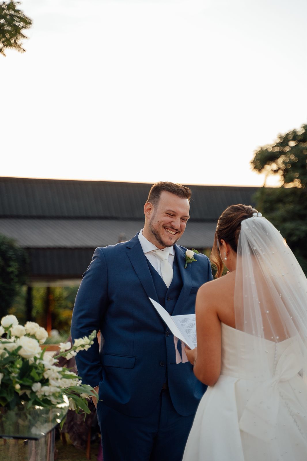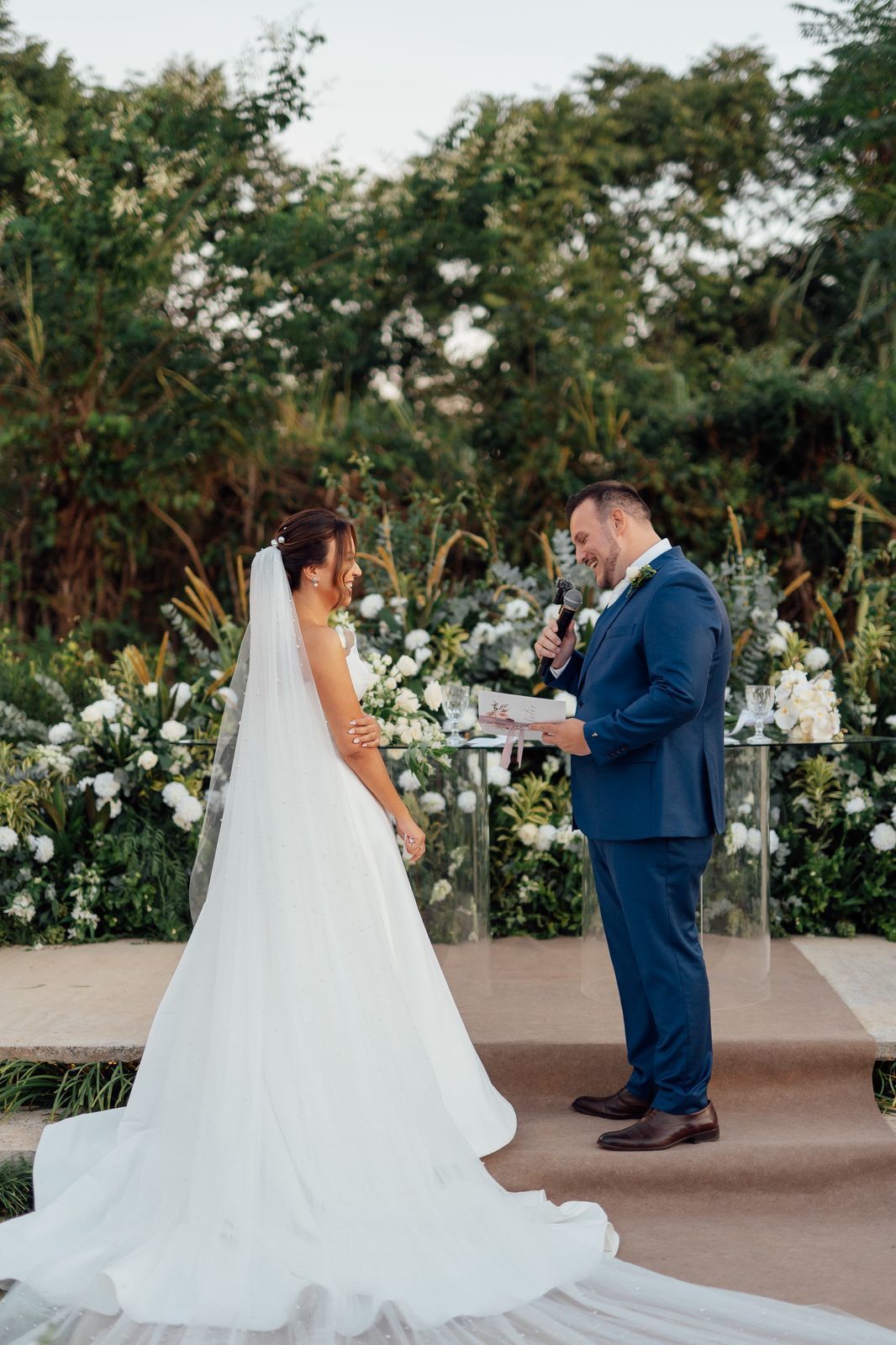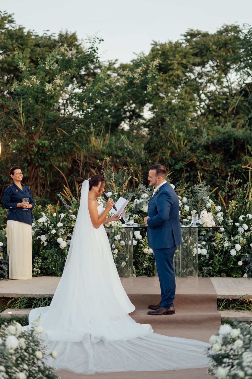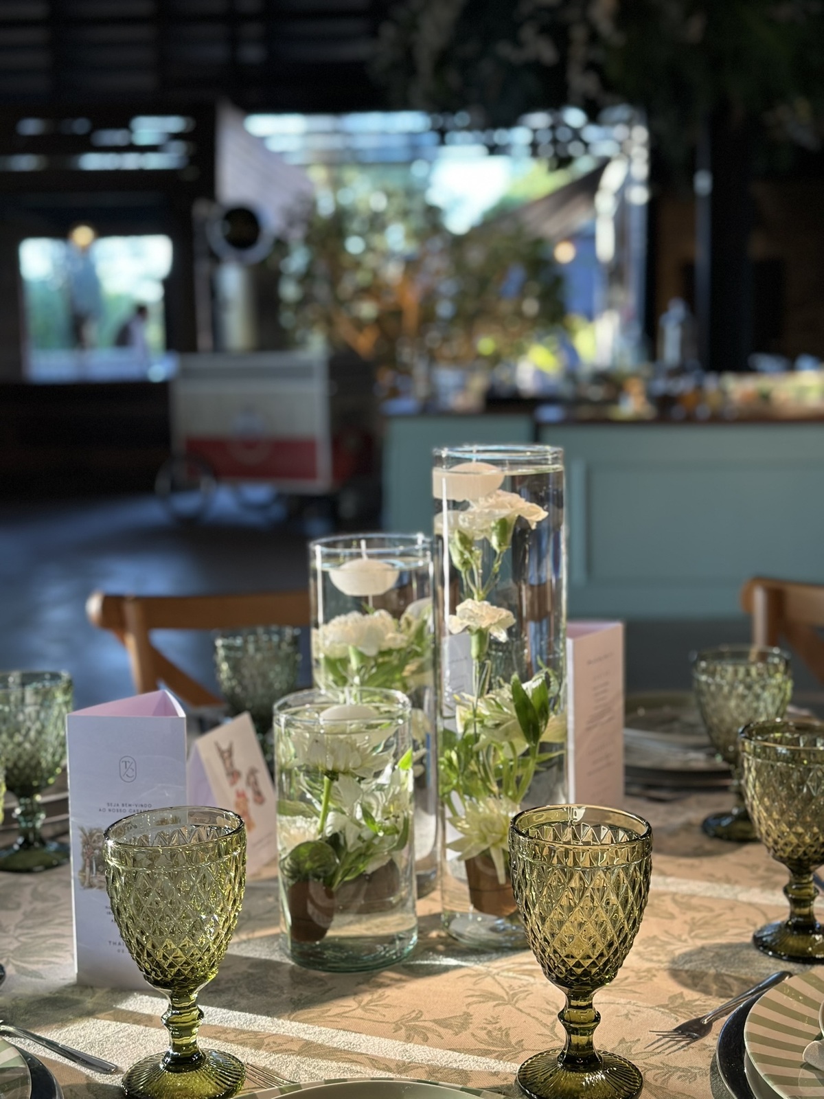 O altar, com base transparente em acrílico e cercado por uma moldura de rosas brancas, folhagens nobres e mini-lustres de chão, refletiu a luz do pôr do sol, criando um momento mágico e inesquecível. O caminho da noiva, ladeado por arranjos generosos, conduziu todos os olhares até o altar, onde a emoção tomou conta.