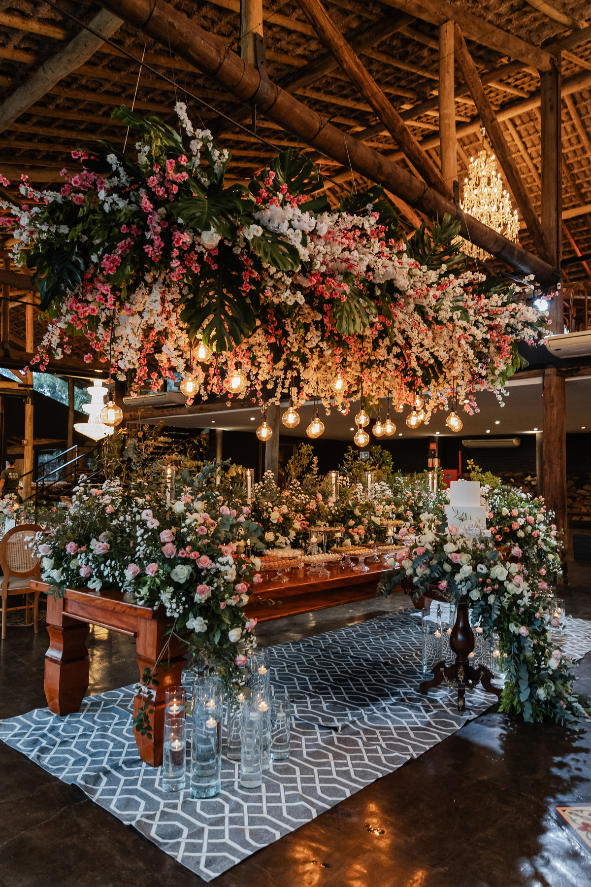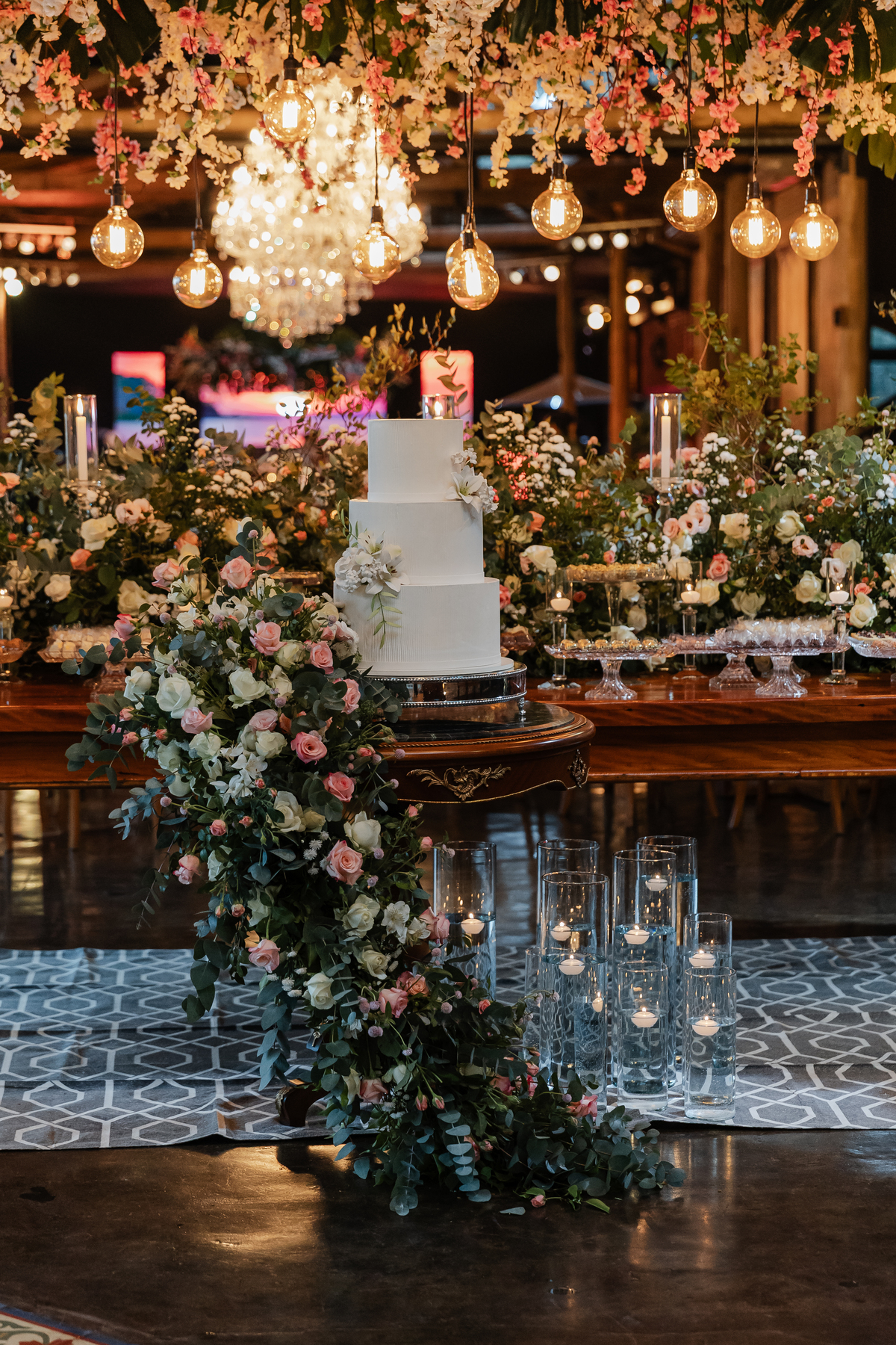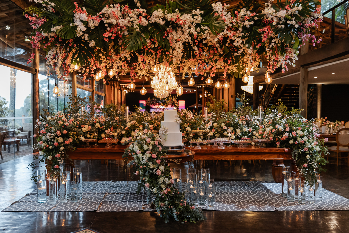 O teto foi transformado em um jardim suspenso exuberante com flores pendentes, folhas tropicais e iluminação quente com lâmpadas em estilo bulbo, criando uma moldura envolvente que emoldurou a mesa de doces como um verdadeiro ponto focal da recepção. No centro, um bolo branco minimalista com aplicação floral seguiu o estilo refinado da decoração.