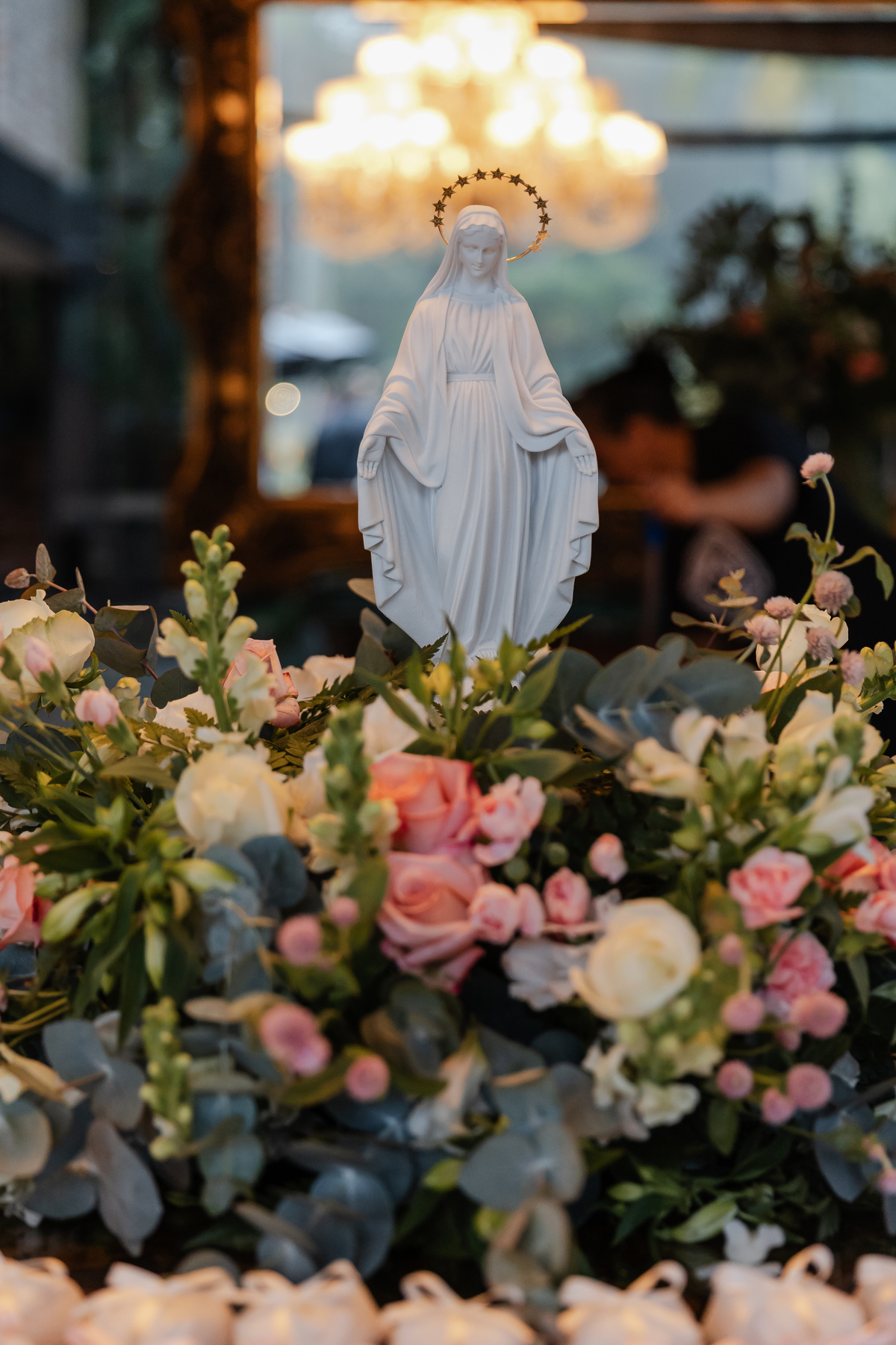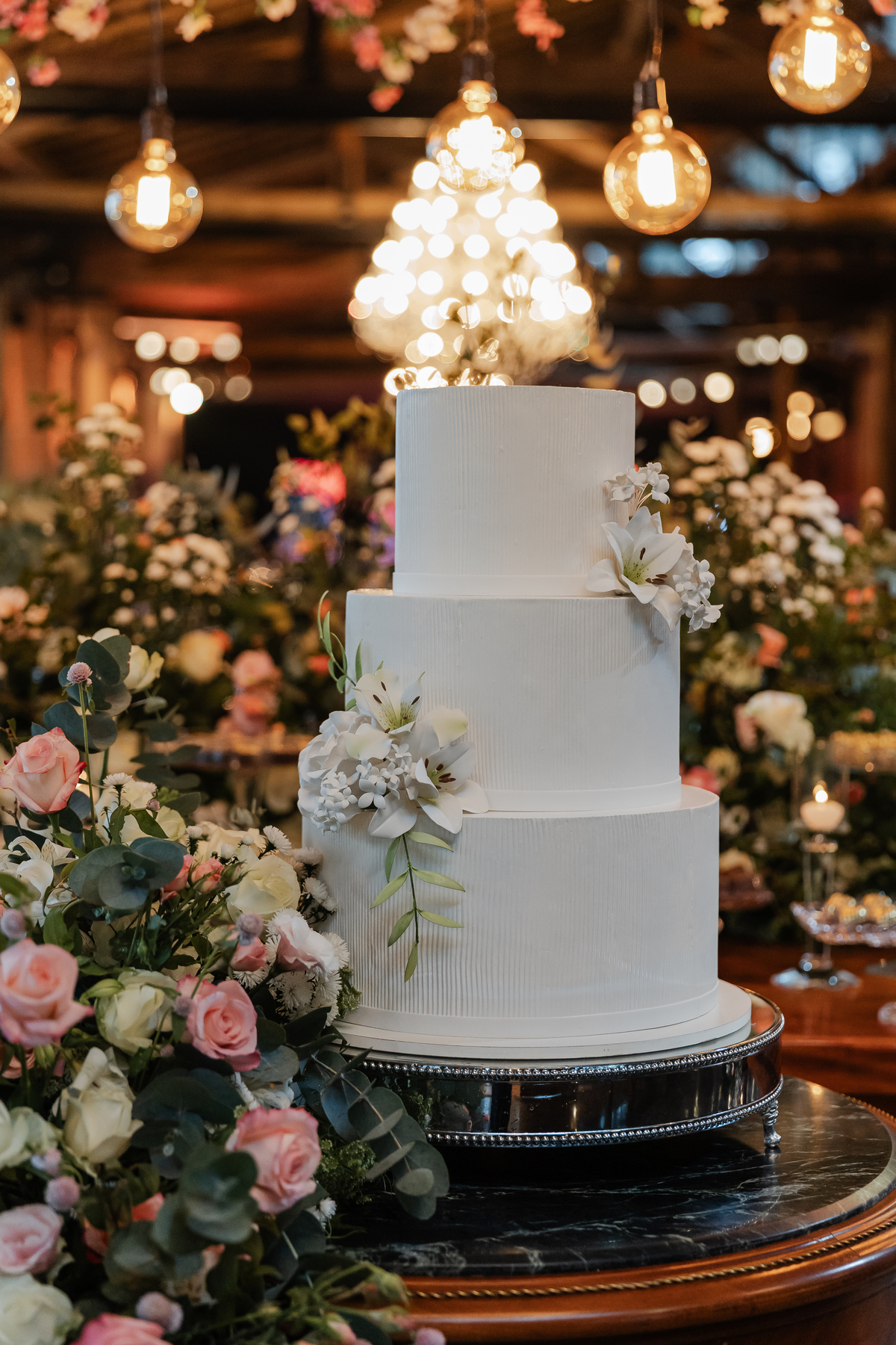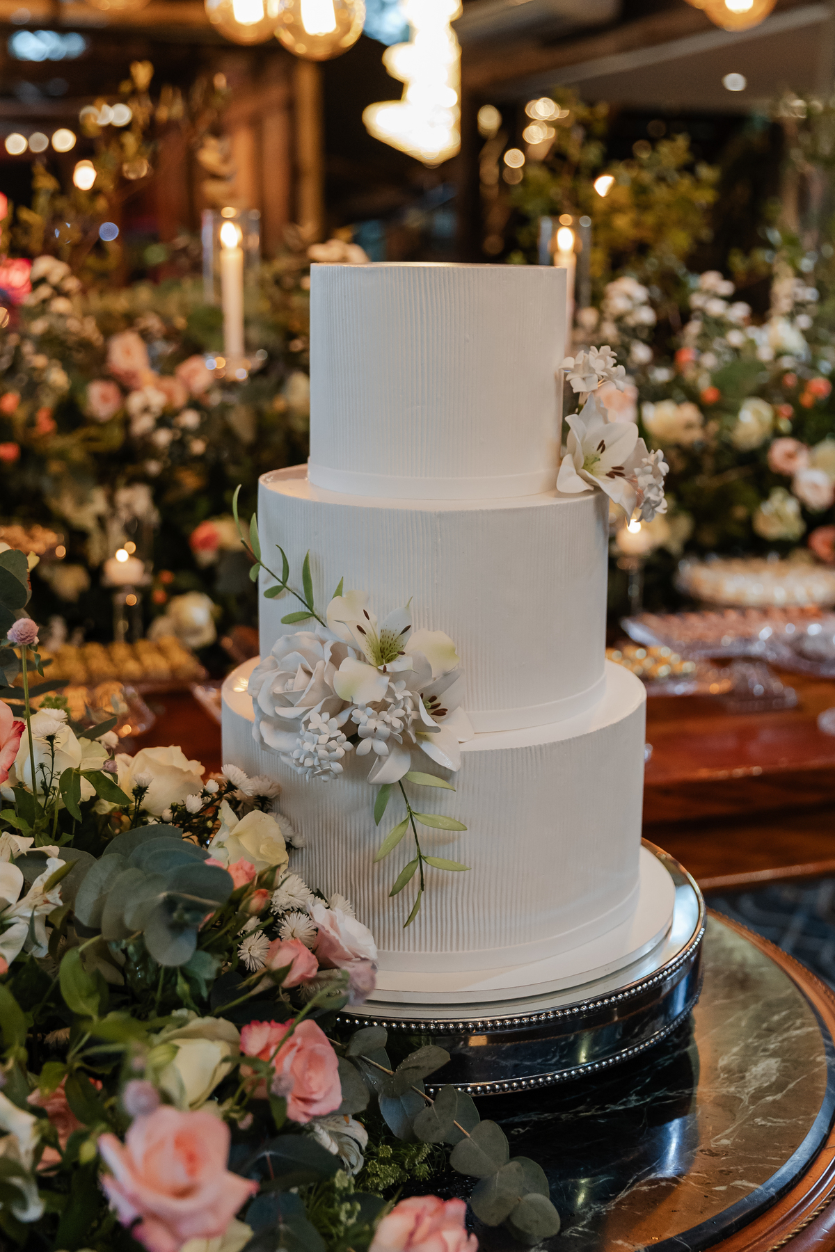 O teto foi transformado em um jardim suspenso exuberante com flores pendentes, folhas tropicais e iluminação quente com lâmpadas em estilo bulbo, criando uma moldura envolvente que emoldurou a mesa de doces como um verdadeiro ponto focal da recepção. No centro, um bolo branco minimalista com aplicação floral seguiu o estilo refinado da decoração.