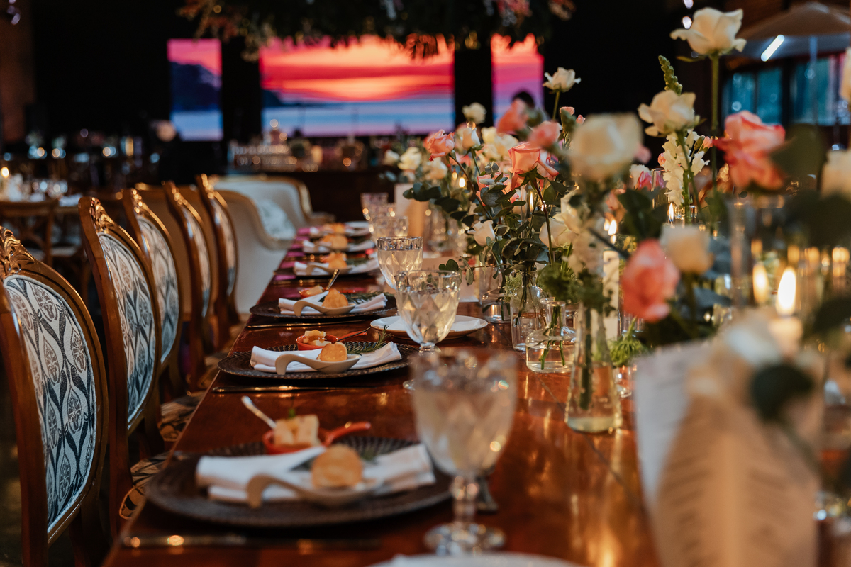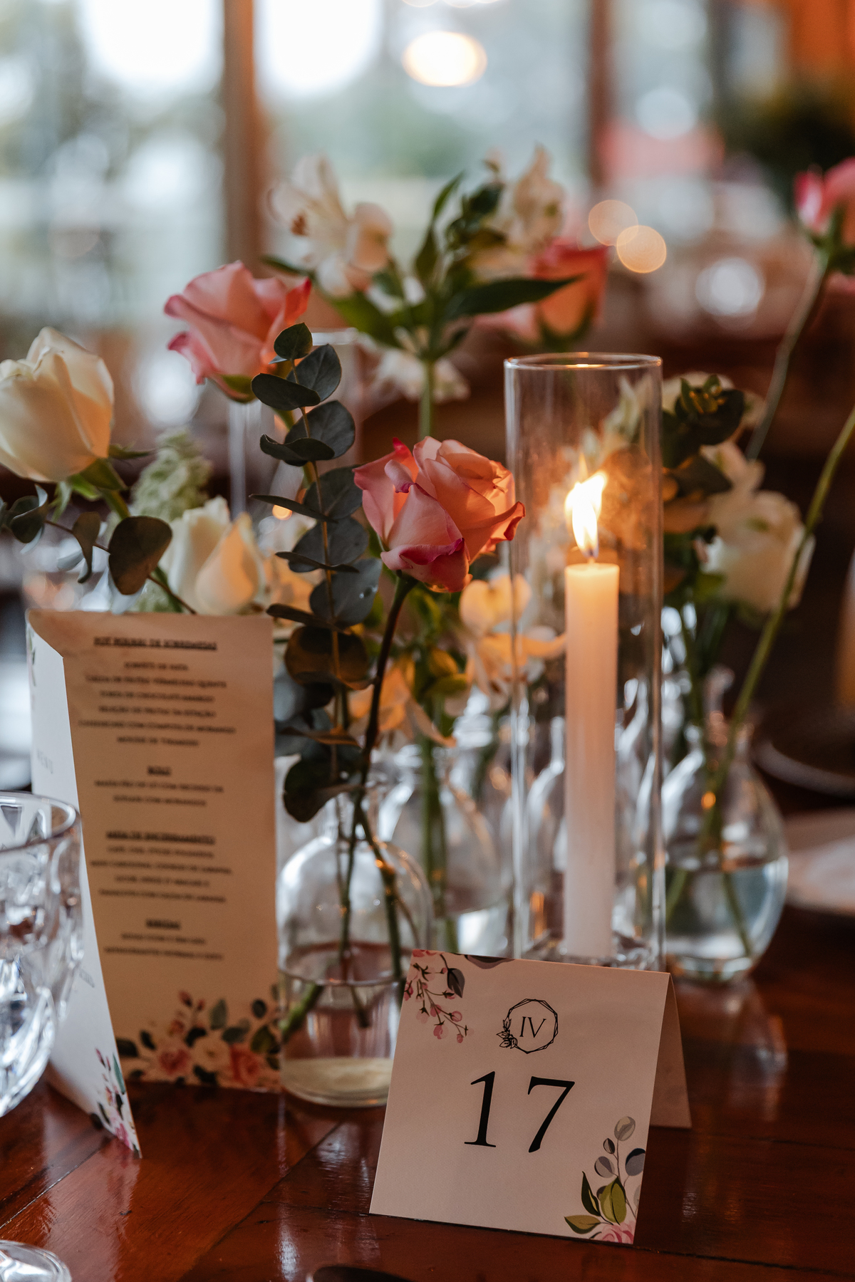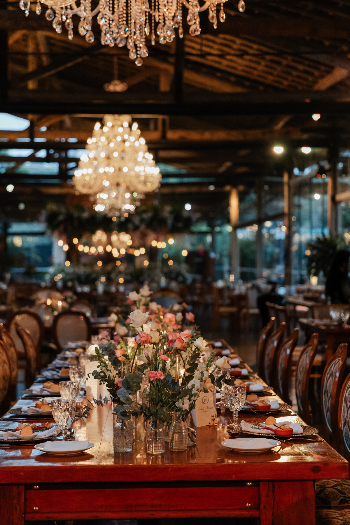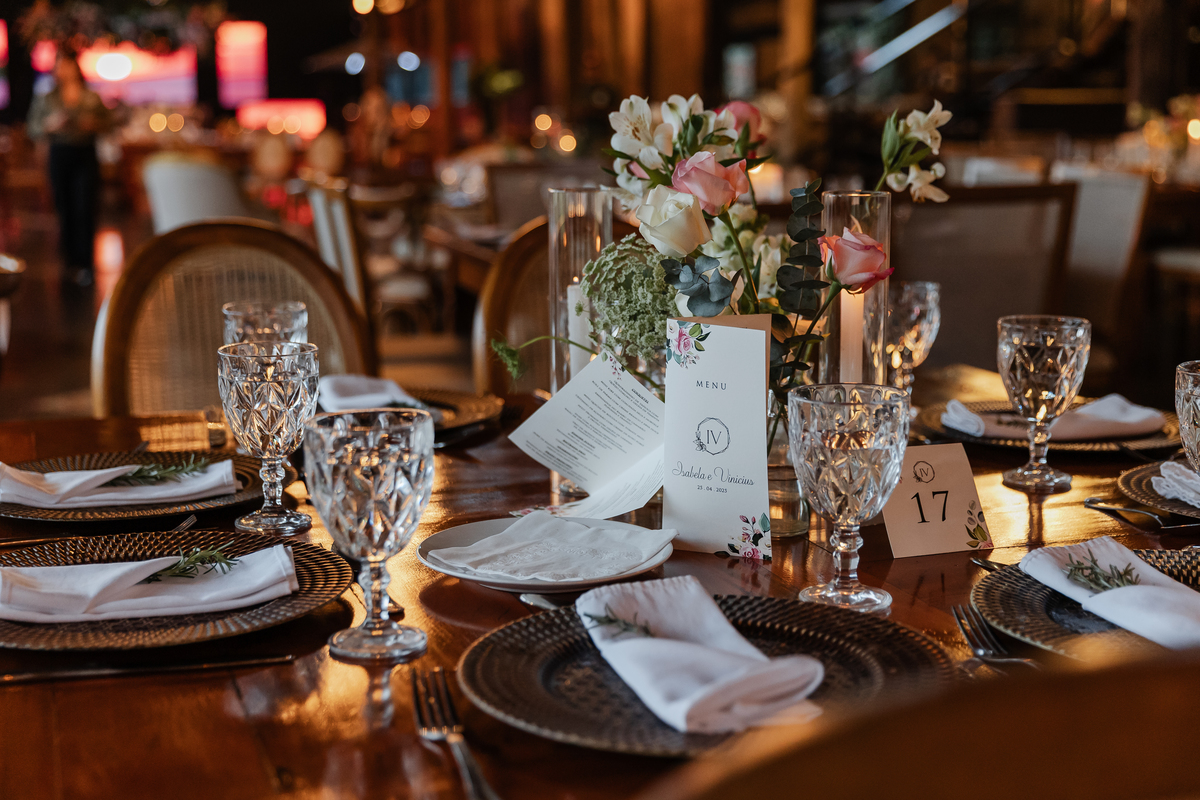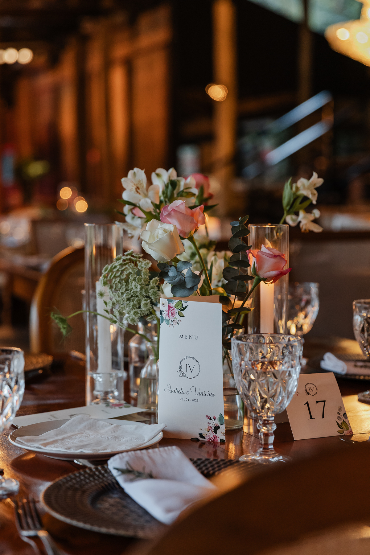 A mesa, em madeira nobre, foi cercada por uma cenografia floral rica em texturas, com rosas brancas, eucaliptos, gipsófilas e flores silvestres, criando volume e movimento com elegância. O uso de velas em cilindros de vidro acrescentou um toque de brilho suave, reforçando a proposta romântica.