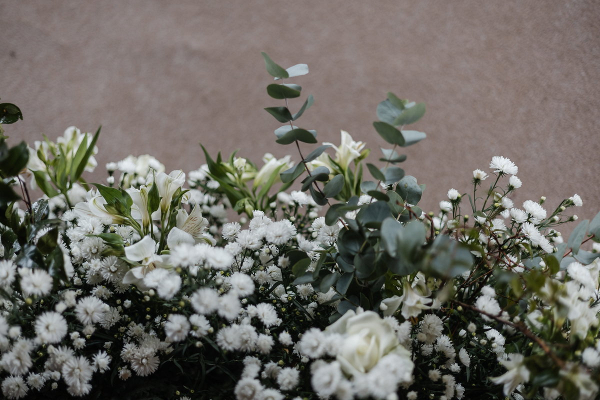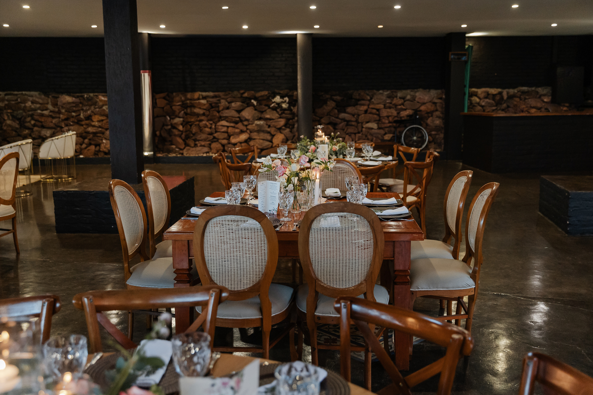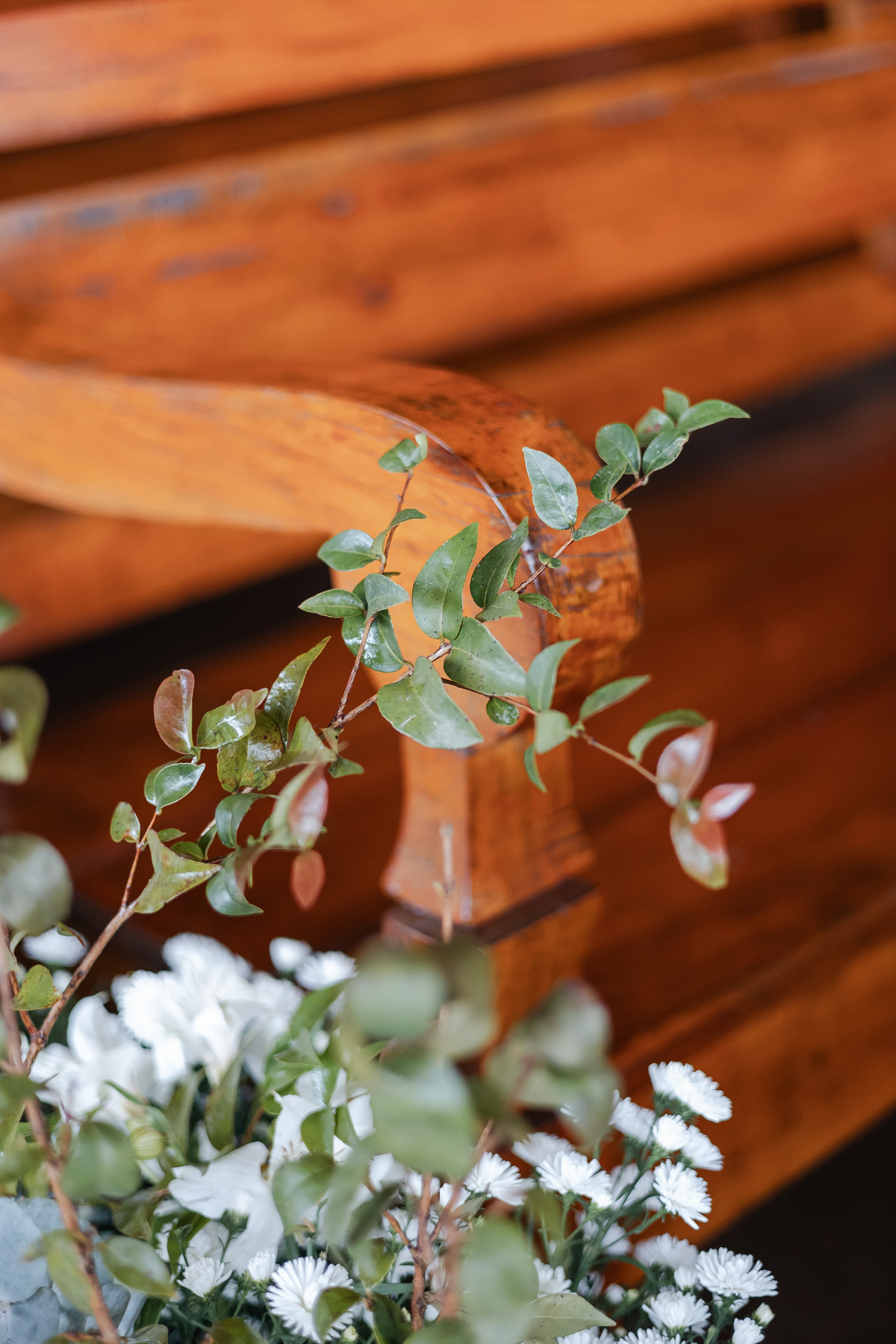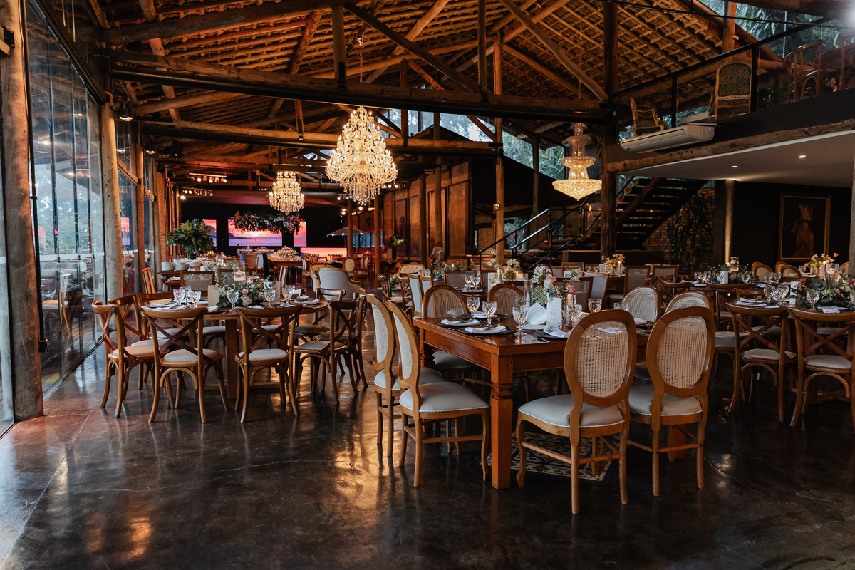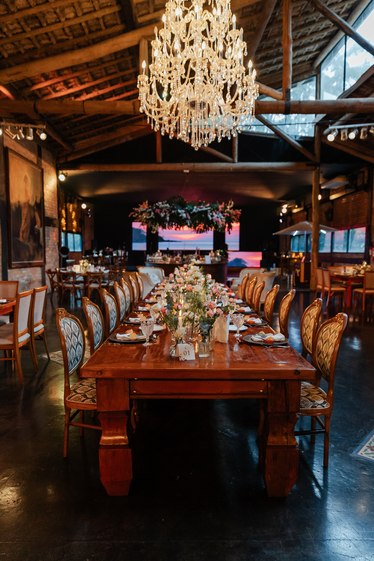 A mesa, em madeira nobre, foi cercada por uma cenografia floral rica em texturas, com rosas brancas, eucaliptos, gipsófilas e flores silvestres, criando volume e movimento com elegância. O uso de velas em cilindros de vidro acrescentou um toque de brilho suave, reforçando a proposta romântica.