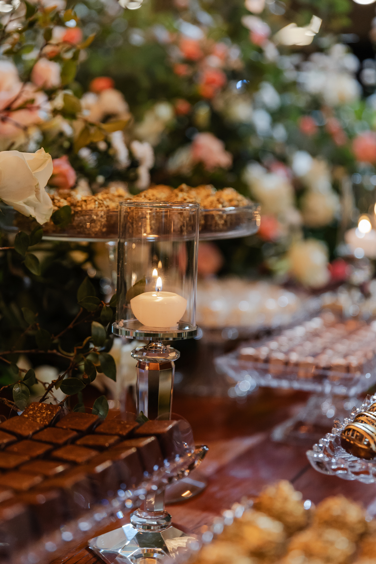 Um verdadeiro espetáculo de elegância e romantismo marcou o casamento de Isabela e Vinícius, realizado no charmoso Espaço Quinta da Cantareira, no dia 25 de abril de 2025. A mesa de doces, ricamente decorada, refletiu um conceito clássico e atemporal com um toque de frescor natural.