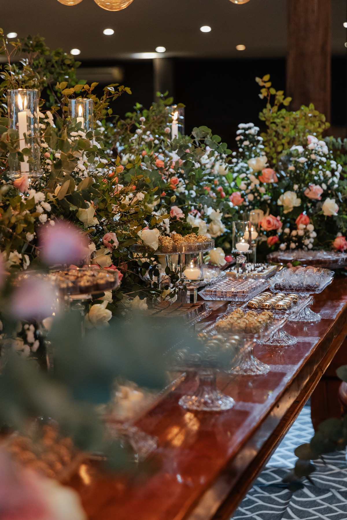 - Mesa de doces clássica com elementos naturais e arranjos volumosos